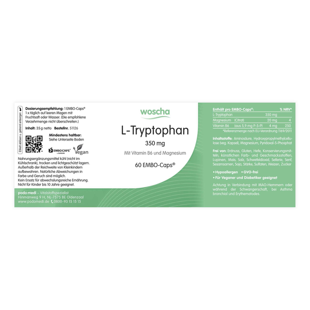 Inhaltsstoffe: L-Tryptophan, Magnesium, Vitamin B6, Hydroxypropylmethylcellulose (veg. Kapsel),